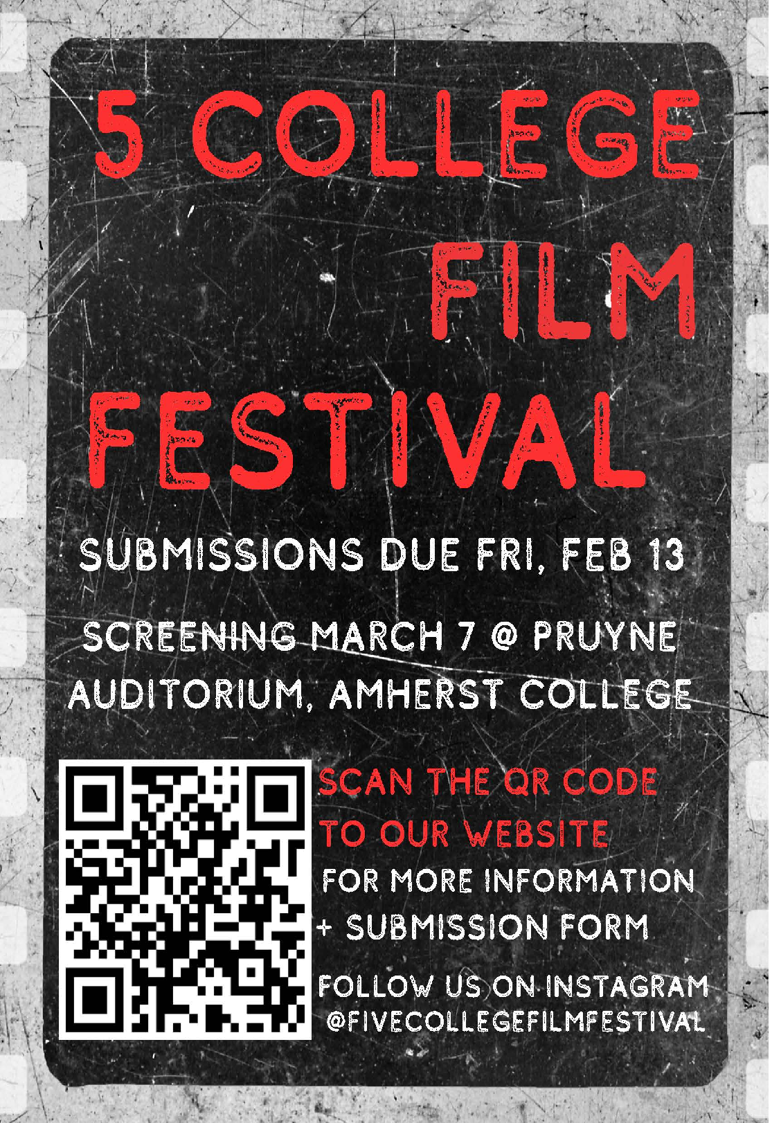 The Five College Film Festival showcases short films from students across the Five Colleges. The mission of The Five College Film Festival’s is to share the stories of students from across the Five Colleges through the medium of film. We hope that all students, regardless of background or experience with filmmaking, share their stories. The annual festival will be held in-person on Saturday, March 7, 1:00PM - 7:00PM at Pruyne Lecture Hall, Amherst College. The festival is organized by students, for students!